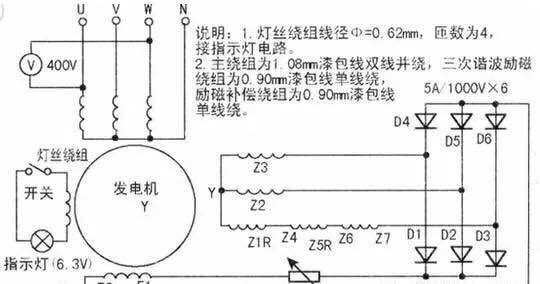 柴油發(fā)電機(jī)組實質(zhì)是臺三次諧波自勵磁凸式三相四線同步發(fā)電機(jī),因具有輸出功率大、適合移動等優(yōu)點,故廣泛用于廠礦、工程施工等場合。雖然功率不同的發(fā)電機(jī),其繞組數(shù)據(jù)有所不同,但電路連接基本相同。